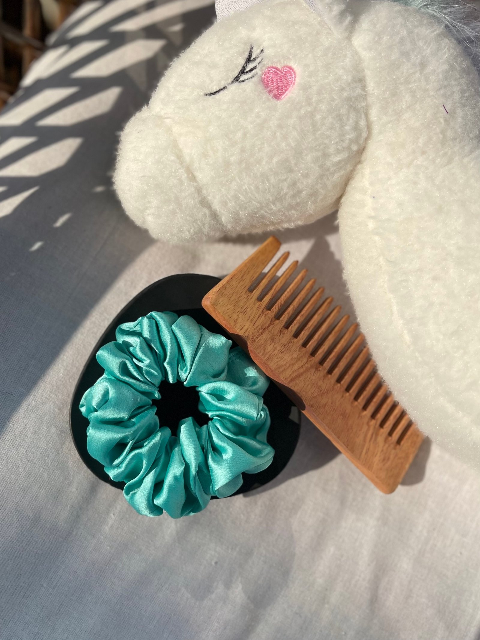 Add few drops of fabric softner or shampoo in a bowl with warm water. Soak your scrunchies a few times/leave it for 3-5 minutes. Rinse off your scrunchies in fresh water. Squeez any excess water and lay them in a warm/sunny spot for a day.